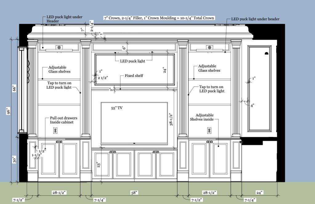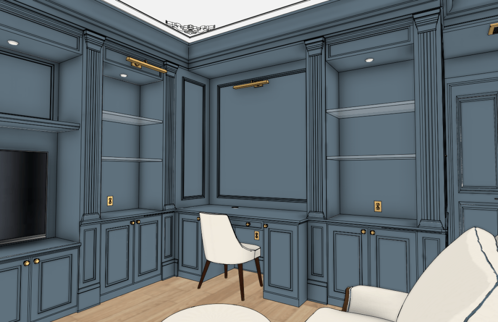 My client has an unused guest bedroom that she wants to turn into a library. We had the best time discussing her goals and how to make the best use of space. These concept drawings are part of a large set of detailed renderings for the room conversion. Just about anything is possible with creativity and imagination!